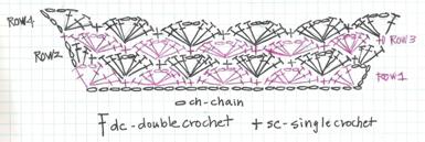 Row 14: Ch 1, sc in ch-2 sp, *SHELL in next sc, sc in next ch-2 sp* 4times, turn. ( 4 SHELLS)